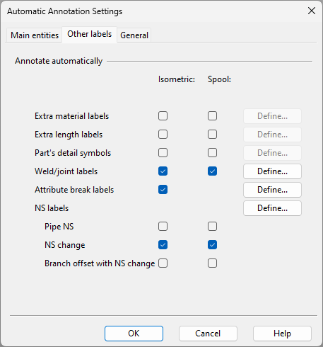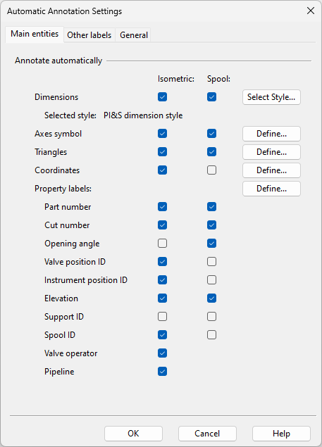 On the Main entities tab, in the Property labels section, clicking Define opens the Property Labels dialog where you can define what kind of property labels automatic annotation should insert into drawings.