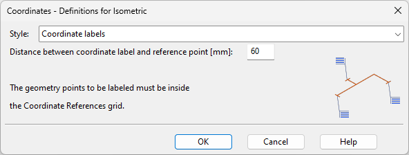 Distance between coordinate label and reference point [mm] – Specify the distance between a label and the referenced geometry point.