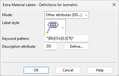 Other attributes (DD...) – Select this option to display the value of a specific tag in the label, using the following settings. Only extra materials that have a "Geometry point index" (gep) tag can be labeled.