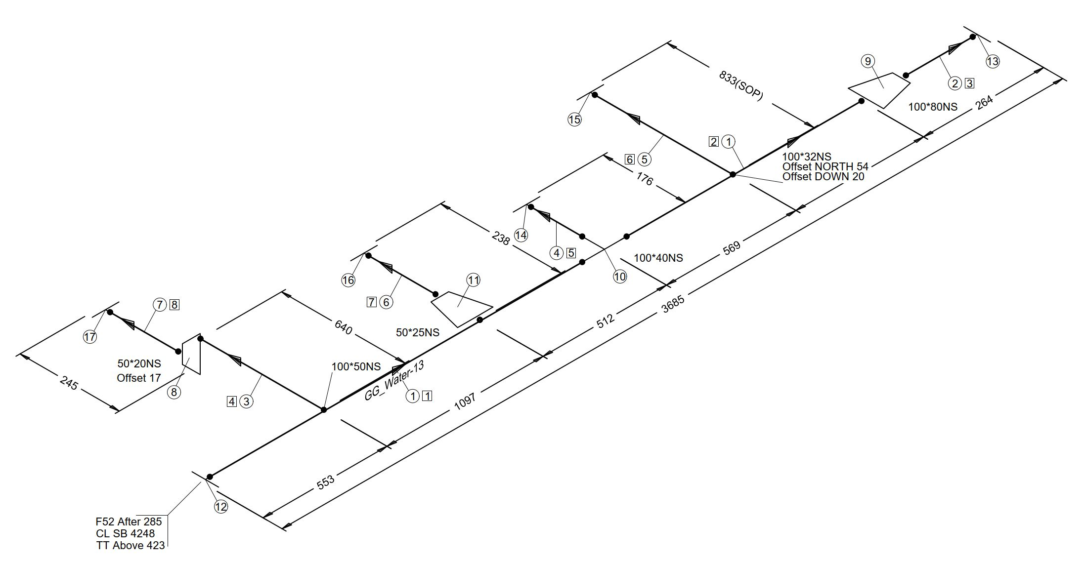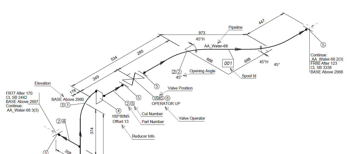 The project administrator can define what kind of annotations the automatic annotation tool should insert into isometric and/or pipe spool drawings. The picture below shows some examples of annotations that automatic annotation has inserted into an isometric drawing.