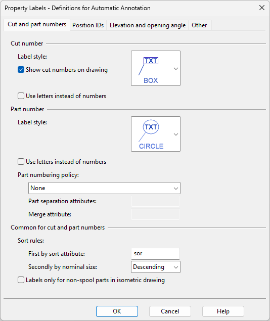 Sort rules – You can set cut numbers and part numbers to be sorted primarily by attribute values (specify the attribute tag) and secondarily by nominal size.