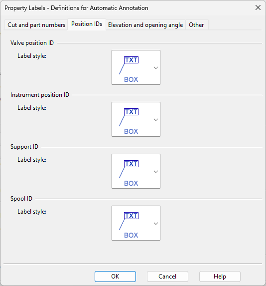 On this tab you can select the visual appearance of Valve position ID, Instrument position ID, Support ID, and Spool ID labels.