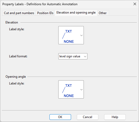 On this tab you can select the visual appearance of labels that show elevation or opening angle. For elevation you can also select the order in which the label shows "level", "sign", and "value".