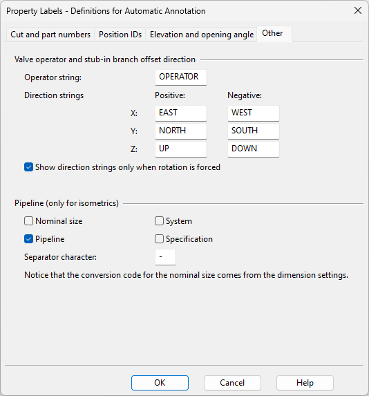- Operator string – Enter the text to show in labels that indicate the direction of an operating device (such as spindle, lever, or hand-wheel in a valve) or an eccentric stub-in branch.