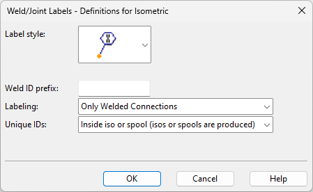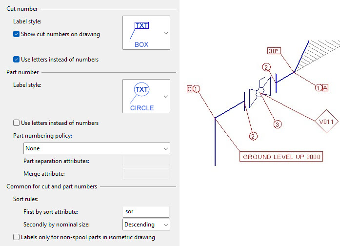 Labels only for non-spool parts in isometric drawing – Select this option if automatic annotation of isometric drawings should only add part number and cut number labels to parts that do not belong to a pipe spool.
