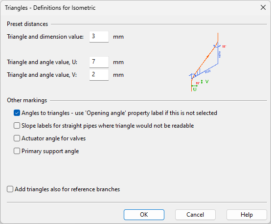 Triangle and angle value [mm] – Specify the distance between the triangle and the angle markings.