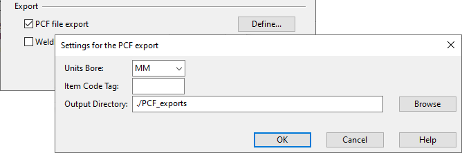 PCF file export – Piping Component File (PCF) export allows CADMATIC to interface with the ISOGEN® system by exporting component and routing information to a text file. For more information, see PCF Export.
