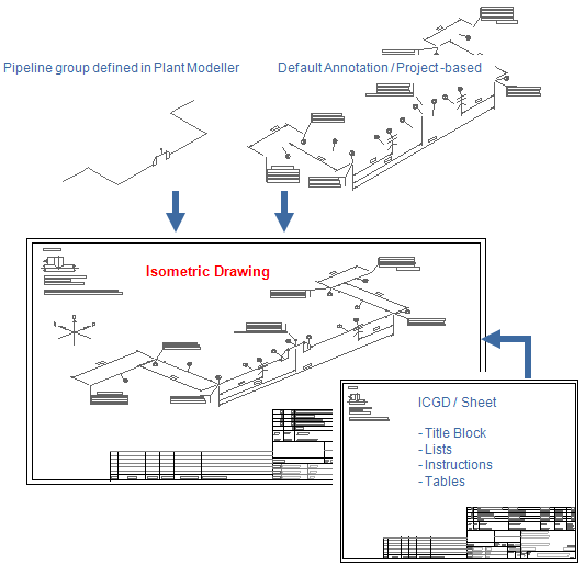 The settings for the Piping Isometrics & Spools application are defined by the administrator who creates or chooses the ICGD (Instructions Controlling Generation of Documents) for the project. The selected ICGD defines the content of the tables and the lists on the drawing sheet. A sheet can include a title block, a part list, a cut list, instructions, and so on.