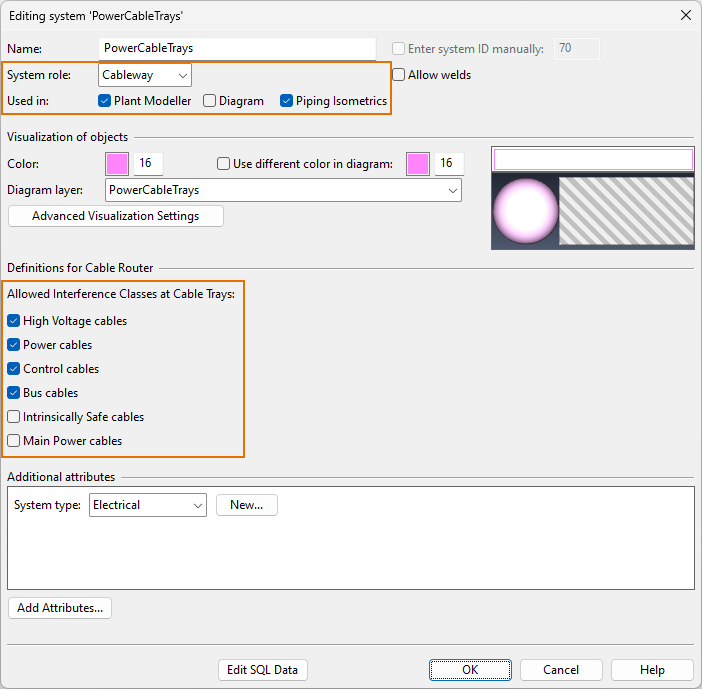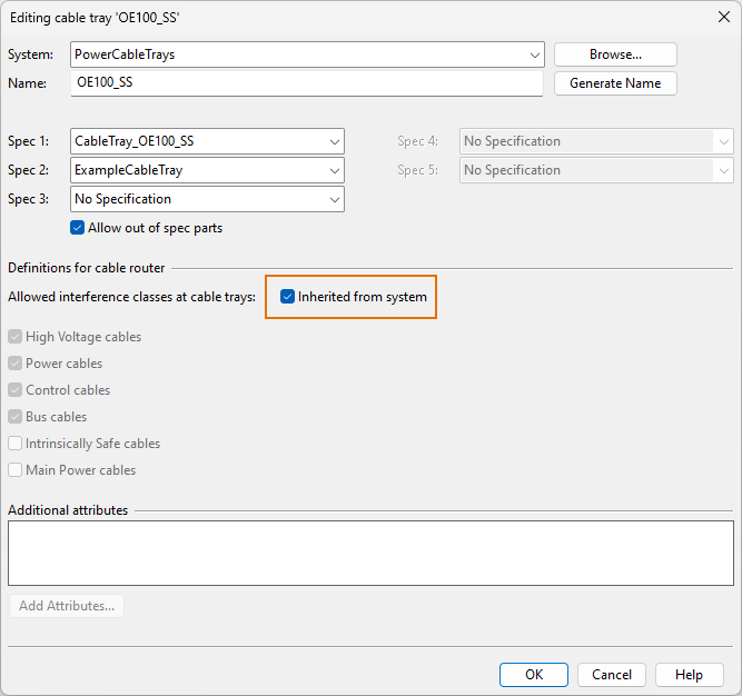Select which interference classes are allowed in cable ways that use this system. Cable trays can then either inherit the interference classes of the system or override the settings.