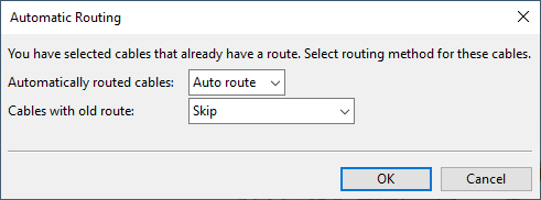 In the Cable Routing section, click Auto. The Automatic Routing dialog opens, listing options that are applicable to the cables you have selected.