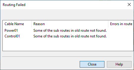 If there are problems, you are prompted whether to browse the failed cables. If you select Yes, the Routing Failed dialog opens, listing the problematic cables and information about them.