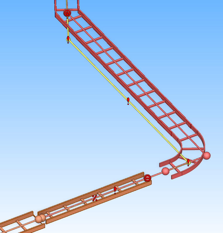 In this example, the old and new routes partly match (brown), but due to some cable trays having been moved, parts of the old route (yellow) do not align with the new route (red):