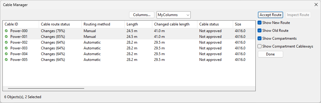 Tip: You can add "Cable routed by" (.GJ) to the columns of the cable list to see who has routed a specific cable and when.