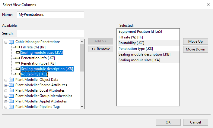 In the Cable Manager Penetrations section of the column editor, you can add the columns "Penetration type" (.K8), "Sealing module description" (.KB), and "Sealing module sizes" (.KA) to see information on sealing modules.