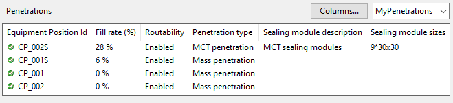 By default, the columns of the penetration list show the Equipment Position Id and fill rate, and whether the penetration is enabled or disabled for cable routing.
