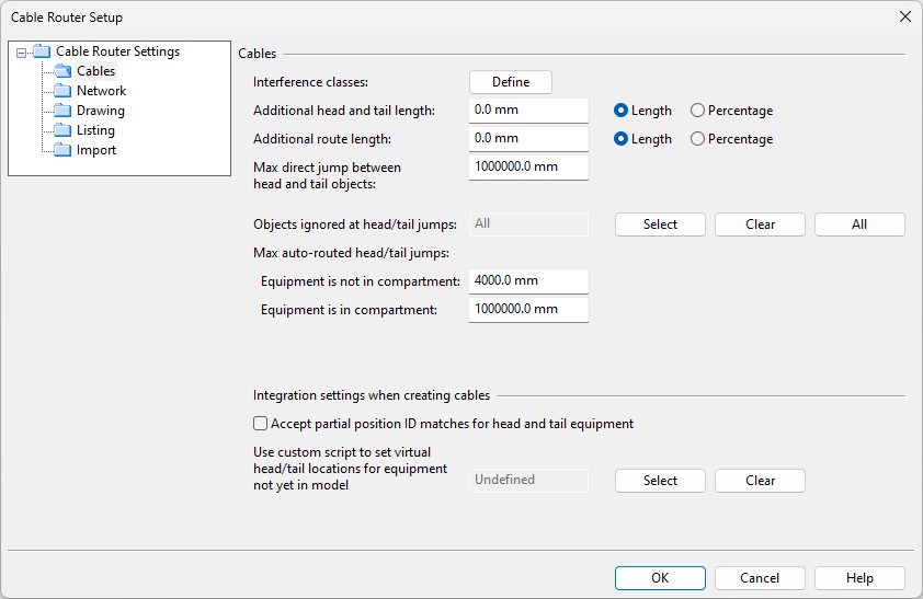 Max direct jump between head and tail objects – Specify the maximum distance (mm) for the cable to go directly from the head equipment to the tail equipment. If the cables are not using the cable ways even though they should, try entering a smaller value here.