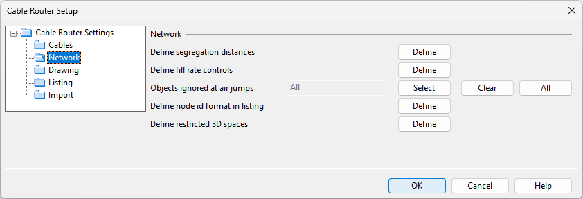In the Cable Router Setup dialog, the Network section contains settings that affect the cable routing network.