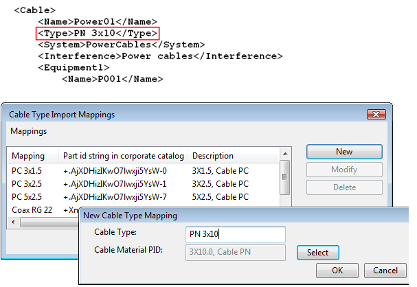 In the New Cable Type Mapping dialog, copy the Cable Type value from XML, and click Select to select the correct catalog part size. Note that there might be several type values for one catalog size.