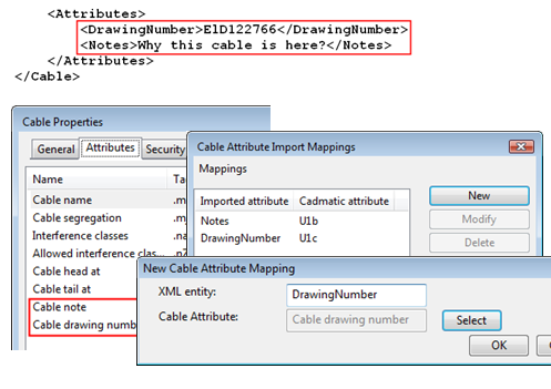In the New Cable Attribute Mapping dialog, copy the XML entity value from XML, and click Select to select the correct COS cable attribute.
