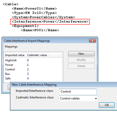In the New Cable Interference Mapping dialog, copy the Imported Interference class value from XML, and click Select to select the correct CADMATIC interference class.