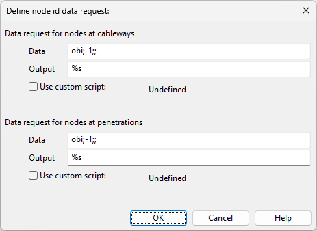 Define node id format in listing – Click Define to open the Define node id data request dialog. Here, you can define data requests that will be used when generating node IDs for cable ways and cable penetrations.