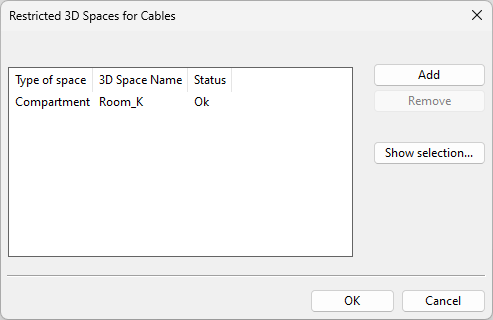 Define restricted 3D spaces – Click Define to open the Restricted 3D Spaces for Cables dialog. Here, you can specify that cables cannot pass through specific 3D spaces.