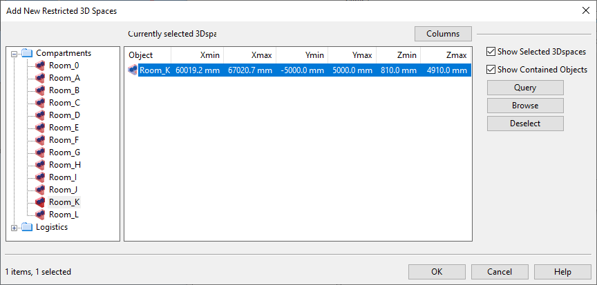 Add – Opens a containment browser where you can define the restricted 3D spaces by selecting them from the tree. Remove an unnecessary restriction by selecting it from the list and clicking Deselect.