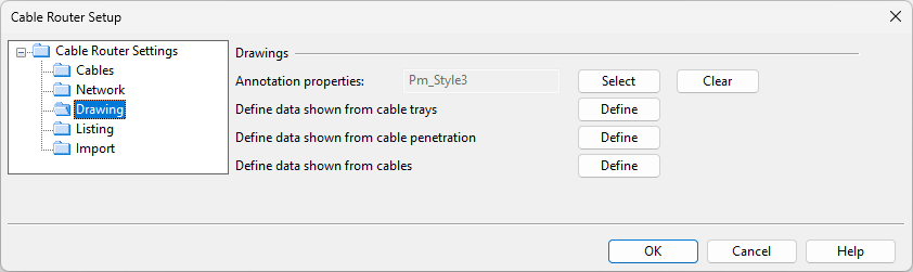 Annotation properties – Click Select to select the Annotation Properties to be used in cable drawings.