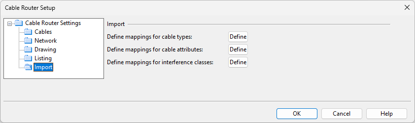 In the Cable Router Setup dialog, the Import section specifies data mappings for importing cables from XML.