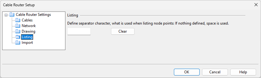 In the Cable Router Setup dialog, the Listing section contains settings that affect generating of listings.