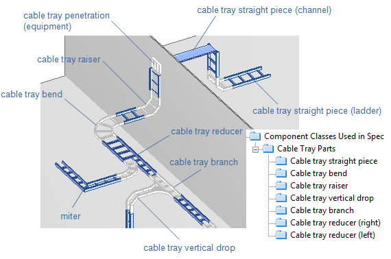 In Plant Modeller, cable ways are constructed of predefined components. Ladder and channel type cable ways are defined as straight parts, and other parts (bends, risers, branches, reducers, and so on) are modeled as Standard Components. Penetrations, however, are modeled as Equipment.
