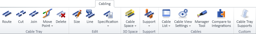 The Cabling tab of Plant Modeller contains tools for routing cable ways and cables. Cable ways can be open or closed cable trays, channels, or cable ladders.