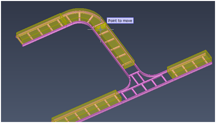 In the Cable Tray group, select a suitable Move Point command to change the geometry of cable trays by moving one connection point. All connected parts are moved along, including Cable Way Spaces and objects that are used to build the cable routing network, and collision control checks for possible collisions. Performing the move requires that the geometry contains enough straight parts so that all the required adjustments can be made.