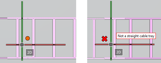 2. Move the cursor near the location where the join should be made. When a connection point is displayed, click to join the cable trays. If the cable trays cannot be joined, for example because one is a cable tray component instead of a straight cable tray piece, a red X is displayed and a message indicates why joining is not possible.