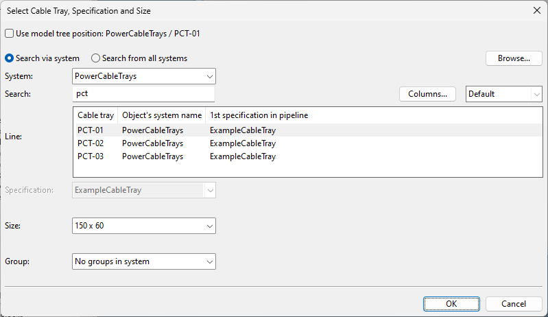 5. Specify the settings for the new cable tray, if they were not inherited.