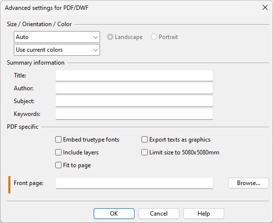 • Front page – Select a DWG or DXF file to use as the cover page of the PDF.