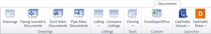 The Documents tab of Plant Modeller contains tools for managing Plant Modeller drawings, duct spool drawings, piping isometrics, pipe spool drawings, and various listings and reports. You can also open CADMATIC Viewer or CADMATIC Draw from this tab.