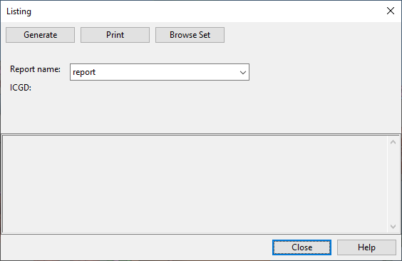 The Listing dialog opens showing the last generated listing or a blank report if nothing has been generated previously.
