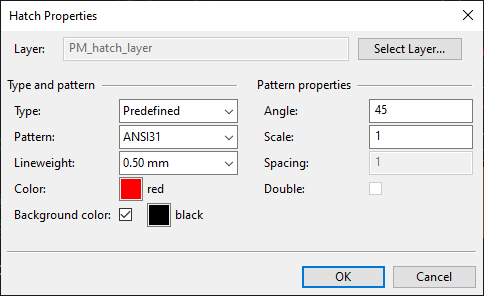 Define the hatch properties. For more information on these properties, see Hatch Properties.
