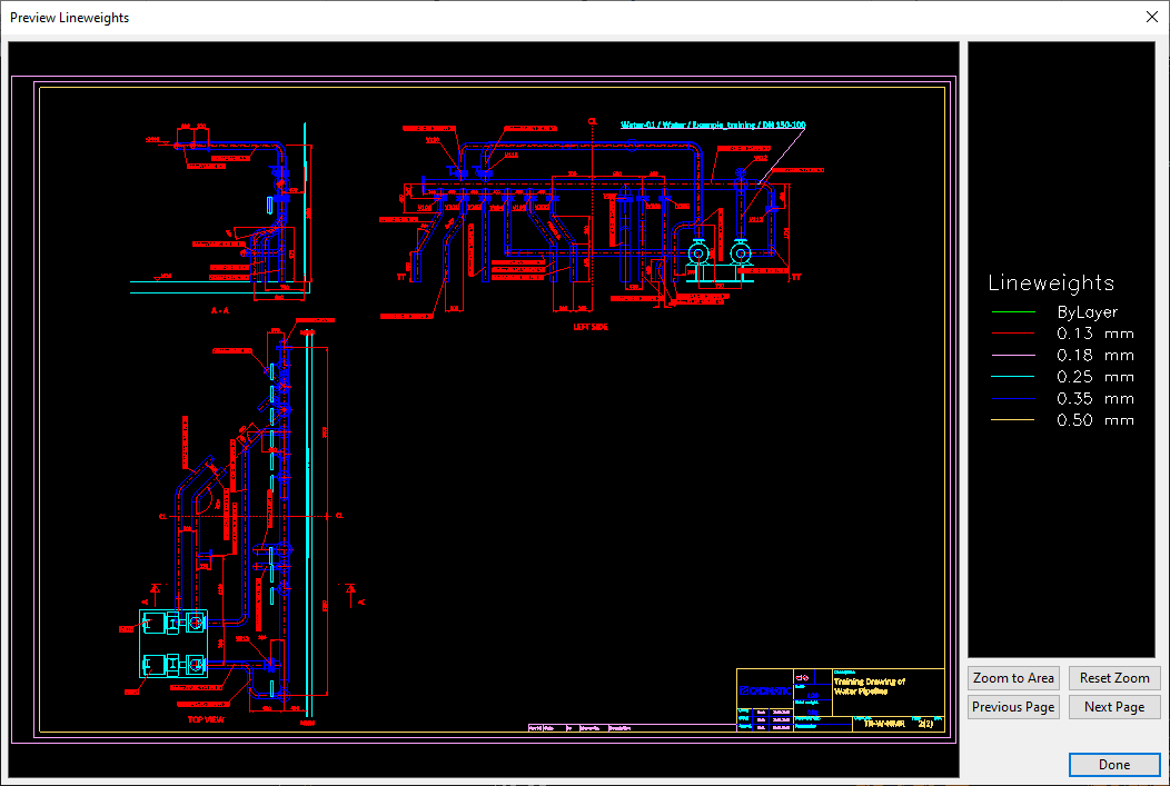 Preview Lineweights opens a window where you can see the active document page so that each different lineweight in the drawing sheet and in the page and view annotations is drawn in a different color.