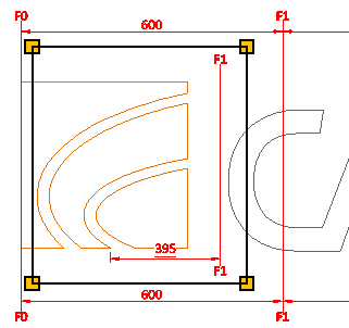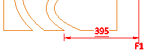 In the example below we can see two grids: one grid shows actual reference lines (F0, F1) while the other grid area is so small that there are no actual reference lines inside it. In the smaller grid area, the user has inserted a virtual grid line which shows that the nearest actual reference line is F1 and the user has dimensioned a point that is 395 mm from the actual F1 line.