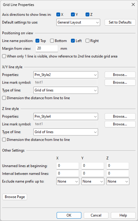 • Properties – Select the Annotation Property Defaults to use for this grid. The annotation properties define what the grid lines (Line Properties), the grid line names (Text Properties, Symbol Properties), and the line-to-line dimensions (Dimension Properties) look like.