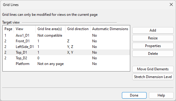 1. On the Home tab, in the Tools group, click Grid Lines. The Grid Lines dialog opens, showing a list of drawing views in the open document. The Grid line area(s) column shows how many grids each drawing view already contains or whether a view cannot have grids because it is not compatible or not on any page.