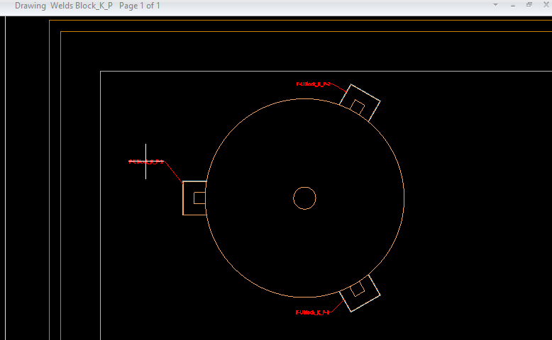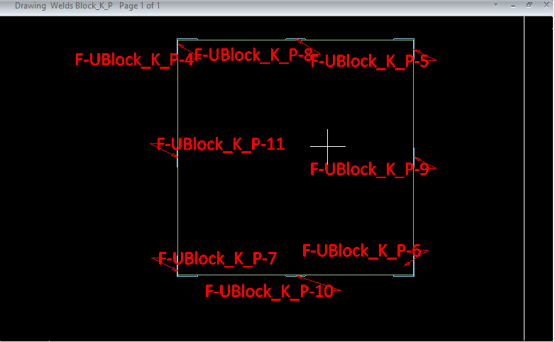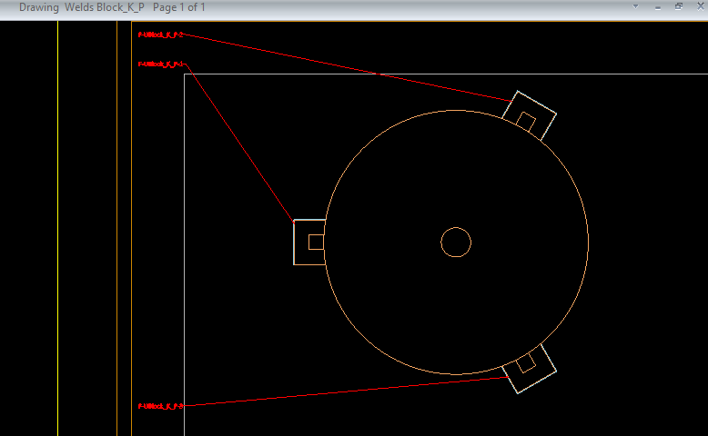 You can allow the program to add a label to all welds that currently have no label in the target view. Each label is placed in the sides of the view, and a reference line connects the label to the associated weld. This labeling style is intended for relatively small views that contain a relatively small number of welds. Otherwise, the reference lines might intersect with the other graphics in the view.