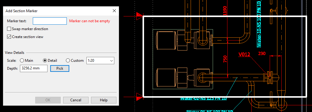 The default boundaries of the section box appear in the drawing view and the Add Section Marker dialog opens.