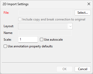 1. On the Import tab, select Drawing > Import. The 2D Import Settings dialog opens.