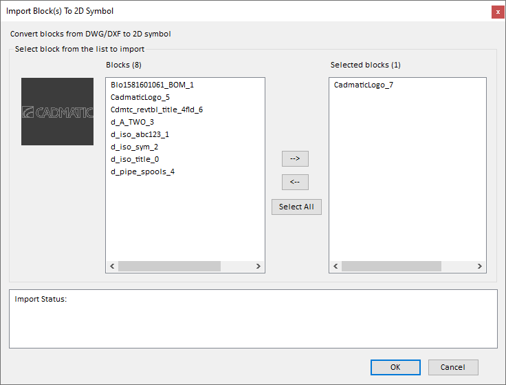 You can import blocks from a DWG or DXF file. After selecting the file, the Import Block(s) To 2D Symbol dialog opens for selecting what to import from the file.