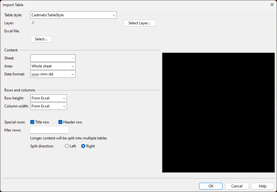 Tables are special drafting objects that can be imported from a Microsoft Excel file. They can also be copied and pasted from a third-party application. The appearance of a table is defined by the Table Style it uses; Table Styles are defined in the Drawing Styles configuration object. If the table is very large, you can split it into several smaller tables during import, which are still managed as a single table entity, or you can choose to import only a specific range of cells. Imported tables remain linked to the original source file, so the contents of the table can be updated if the source file is modified after the import.