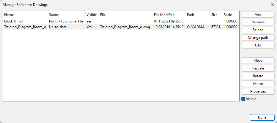 You can use the Manage Reference Drawings dialog to manage the reference drawings of the active view. For each imported drawing, you can see their name, status, visibility, file name, file modification date, file path, file size, and scale. The Status column indicates if the imported drawing still matches the original file, or if the drawing is not linked to the original file.