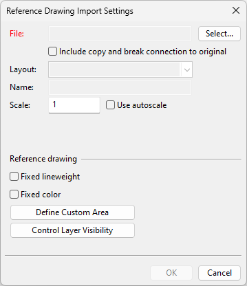 • Scale – Define the scale of the reference drawing by entering a specific scaling factor. Scaling factor 1 imports the reference drawing using its original dimensions.